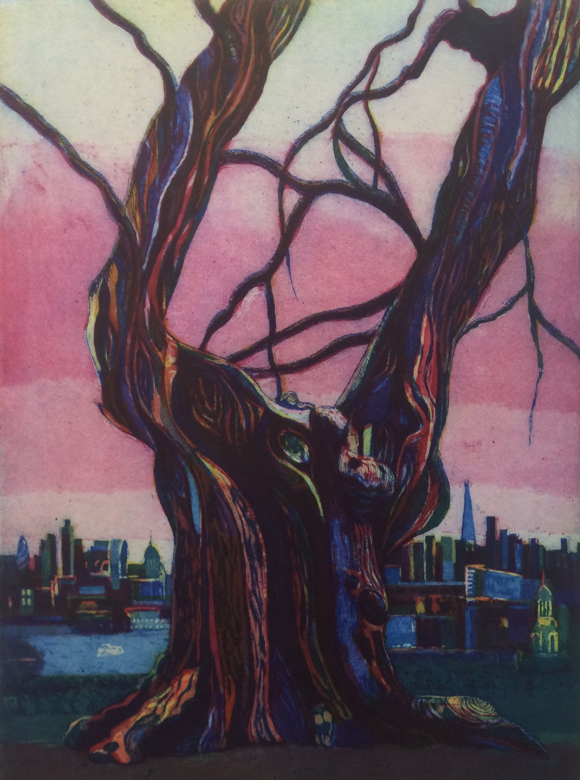 One of my favourite colour etchings by Karen is The Old Chestnut, Greenwich Park. I love it because the tree trunk - something that we typically tend to think of in single-colour terms: either brown or grey - truly seems to encompass a full rainbow of colours. Karen has built up this chestnut's knotted trunk and branches with ribbons of colour. Some of these wooden veins are clearly printed only with the yellow, red, or blue plate. But others are a dark purplish-brown that's been achieved by printing with all three colours. Other parts of the trunk are the result of printing two plates.